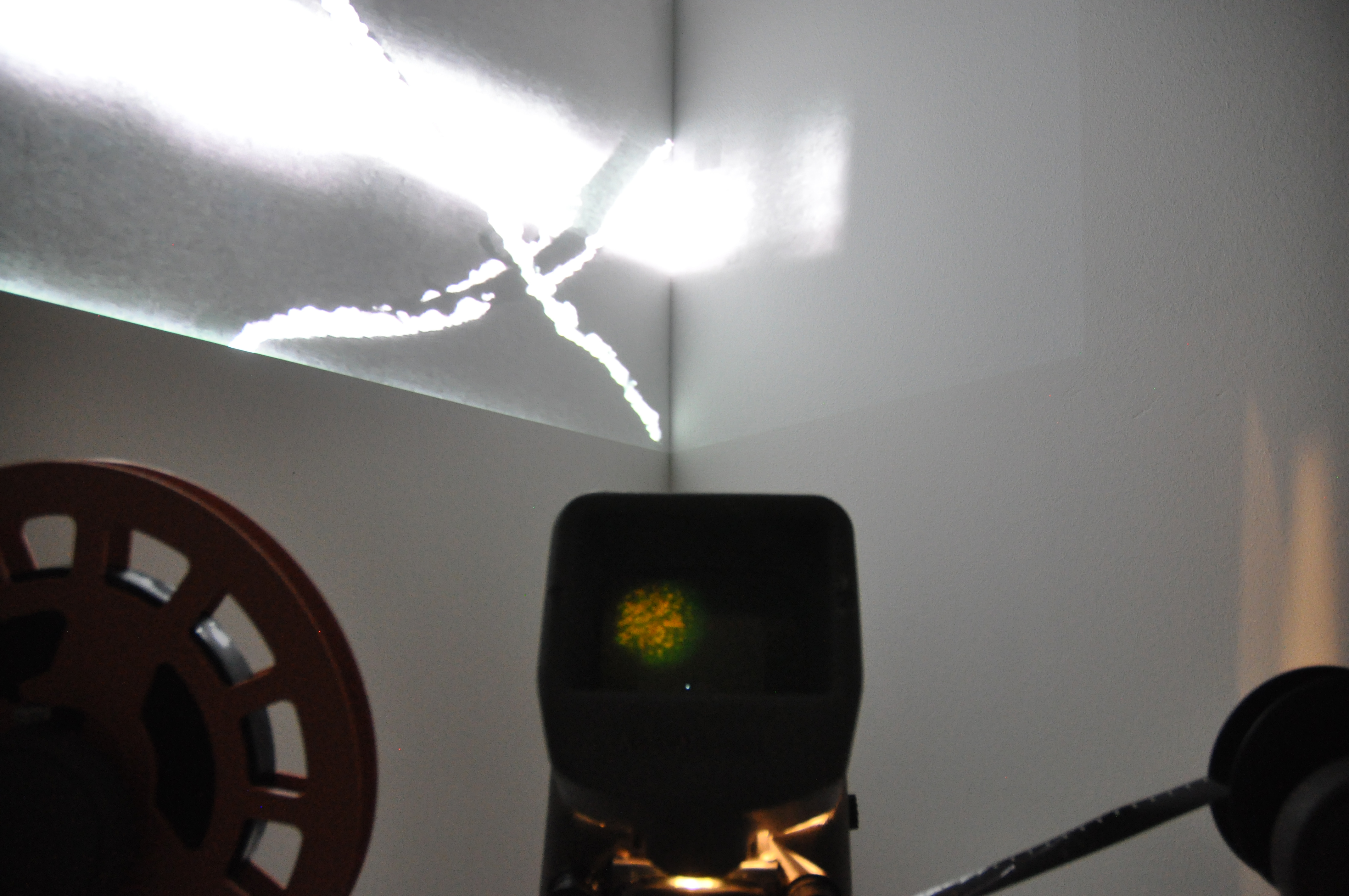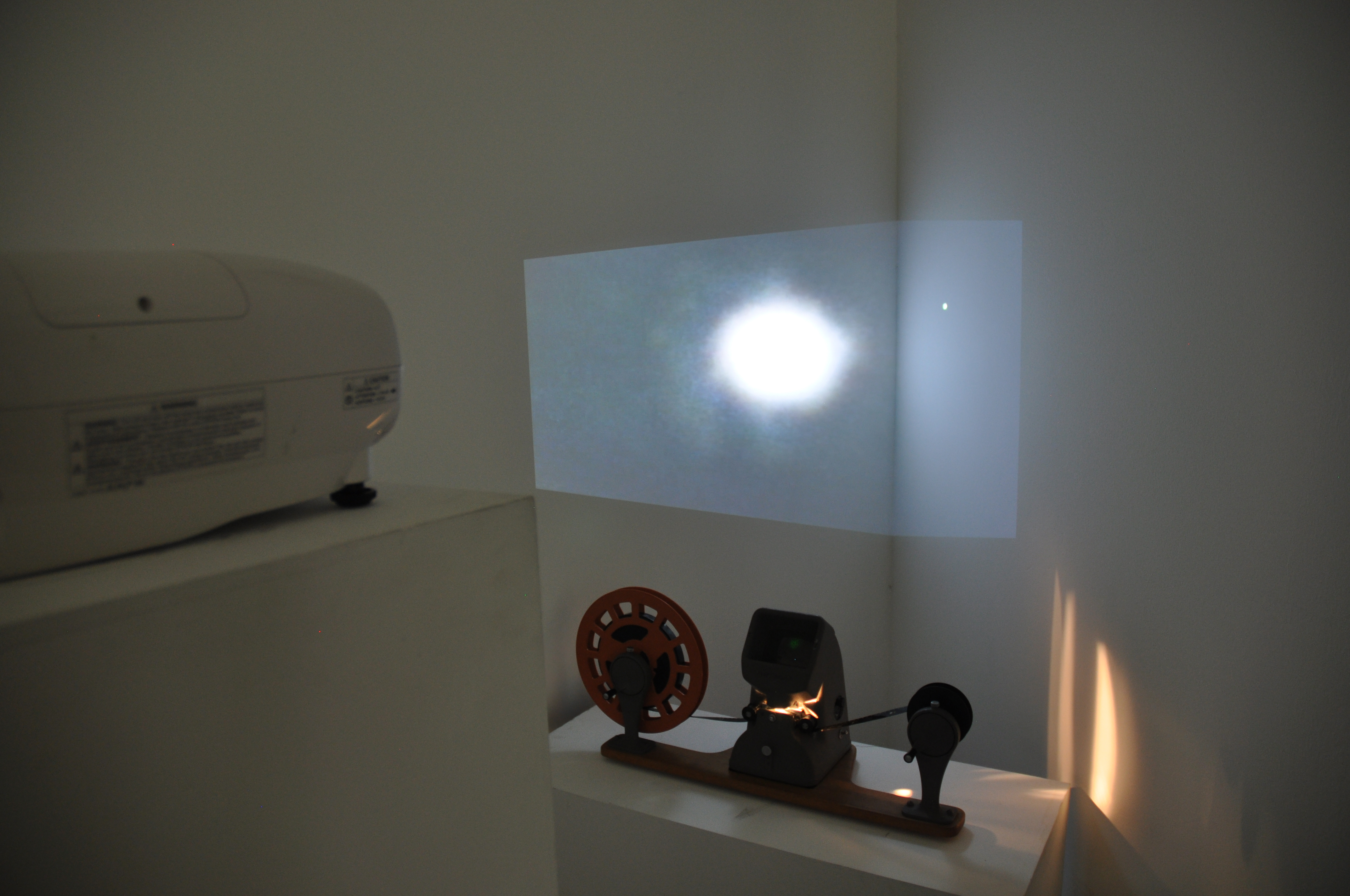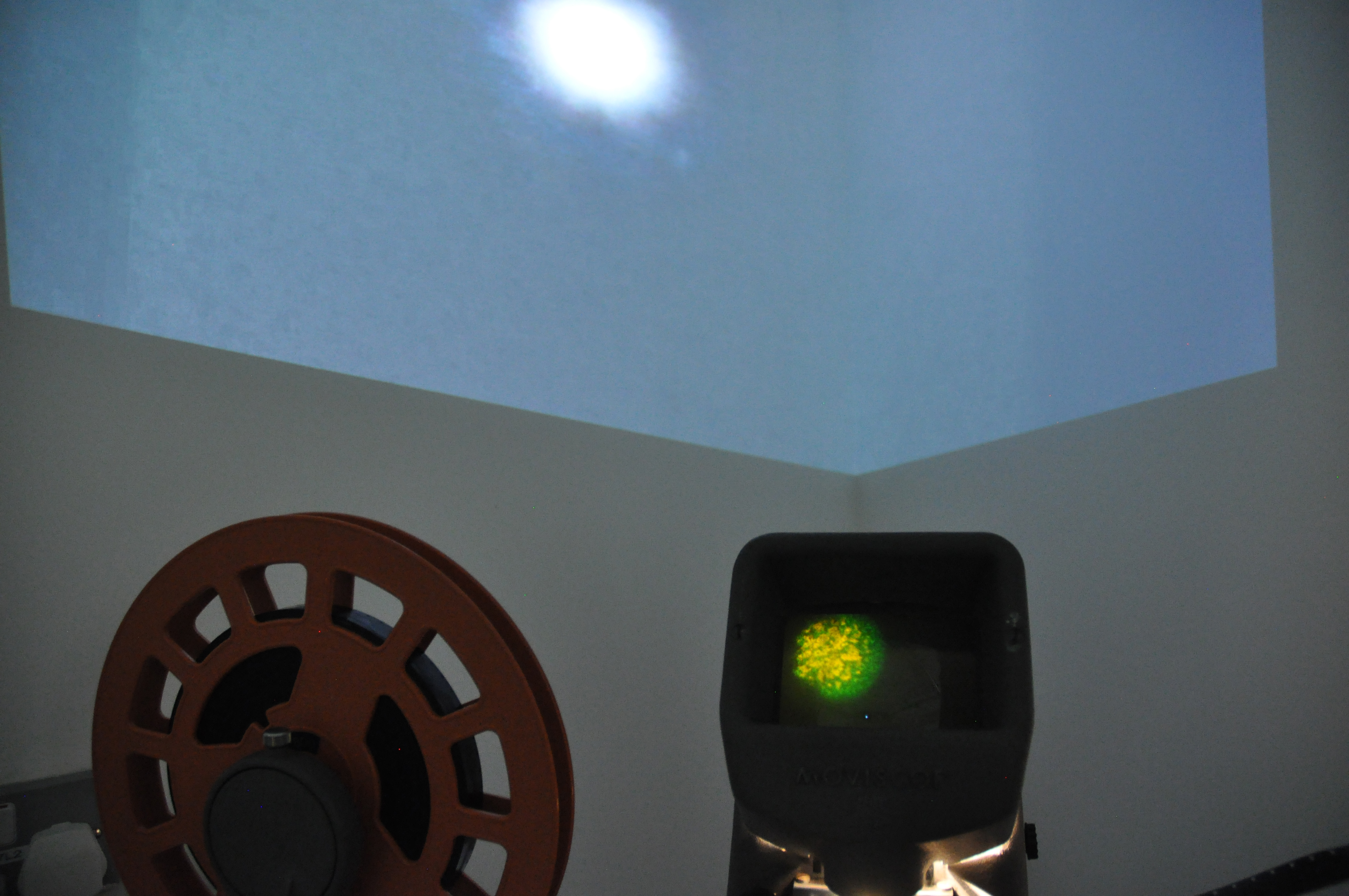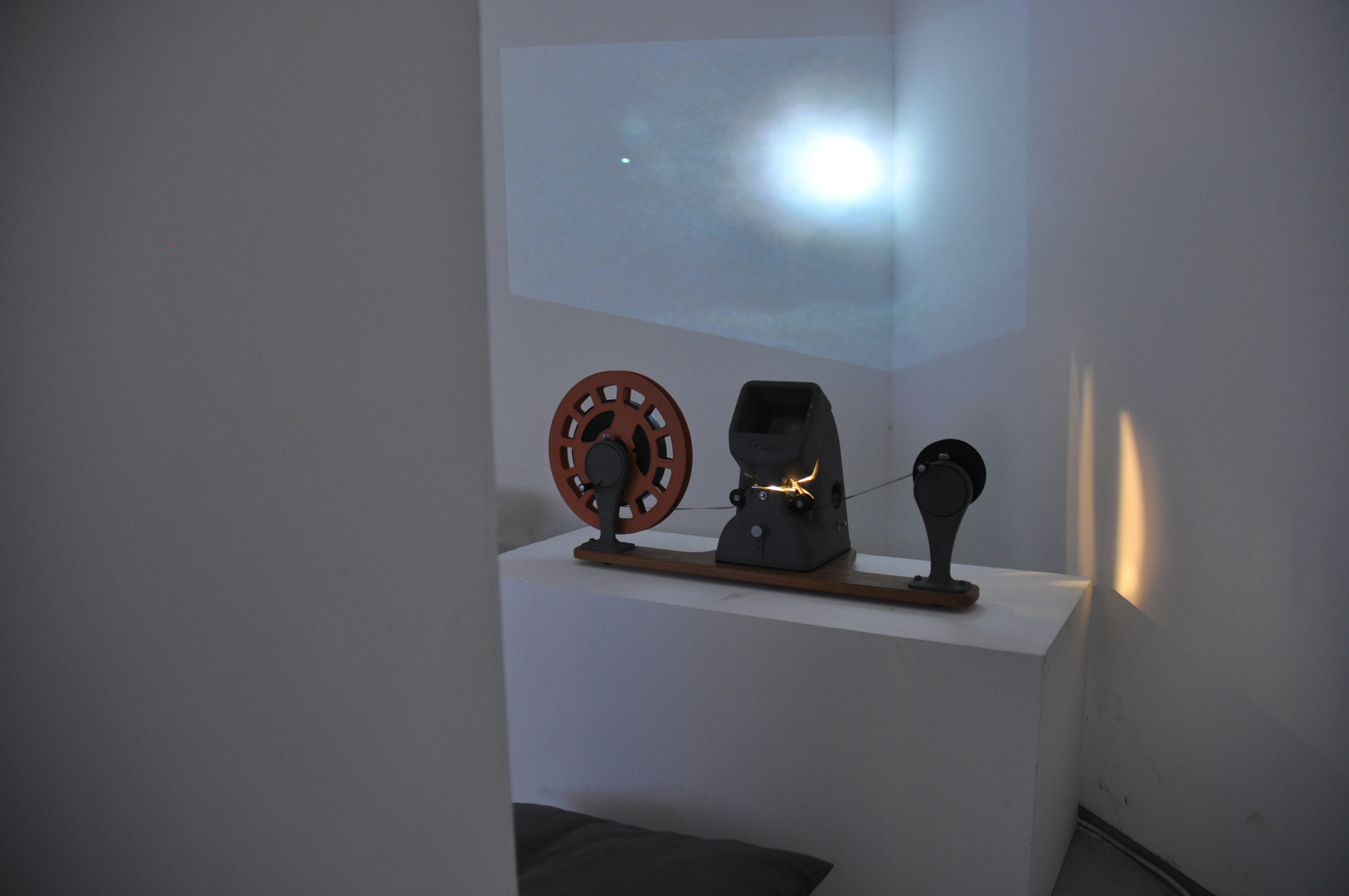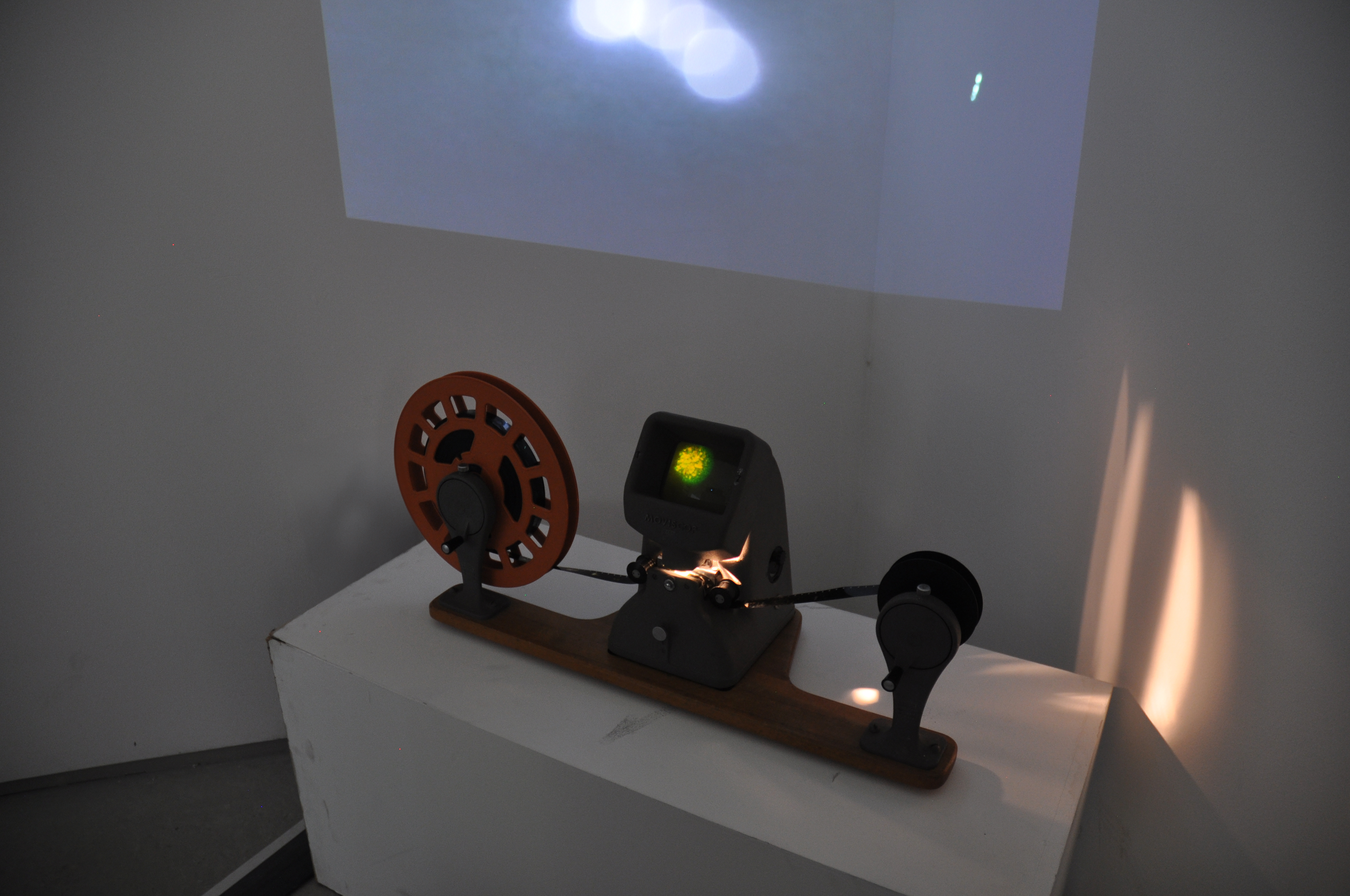 Here you can see a small part of an installation that included two 16mm films and two digital films layered to create one. The 16mm film, that was projected on the wall, was exposed and made during a workshop with the video artist Vicky Smith. The result was compiled with the digital video of the moon and the green star. In front of the display was a short plinth that contained a second 16mm film that I made using bleach. Viewers could sit down and play the film by turning it at their own pace, examining the inperfections through the viewfinder. I decided to place my installation in a corner to emphasise the movement and space between the moon and the green star.