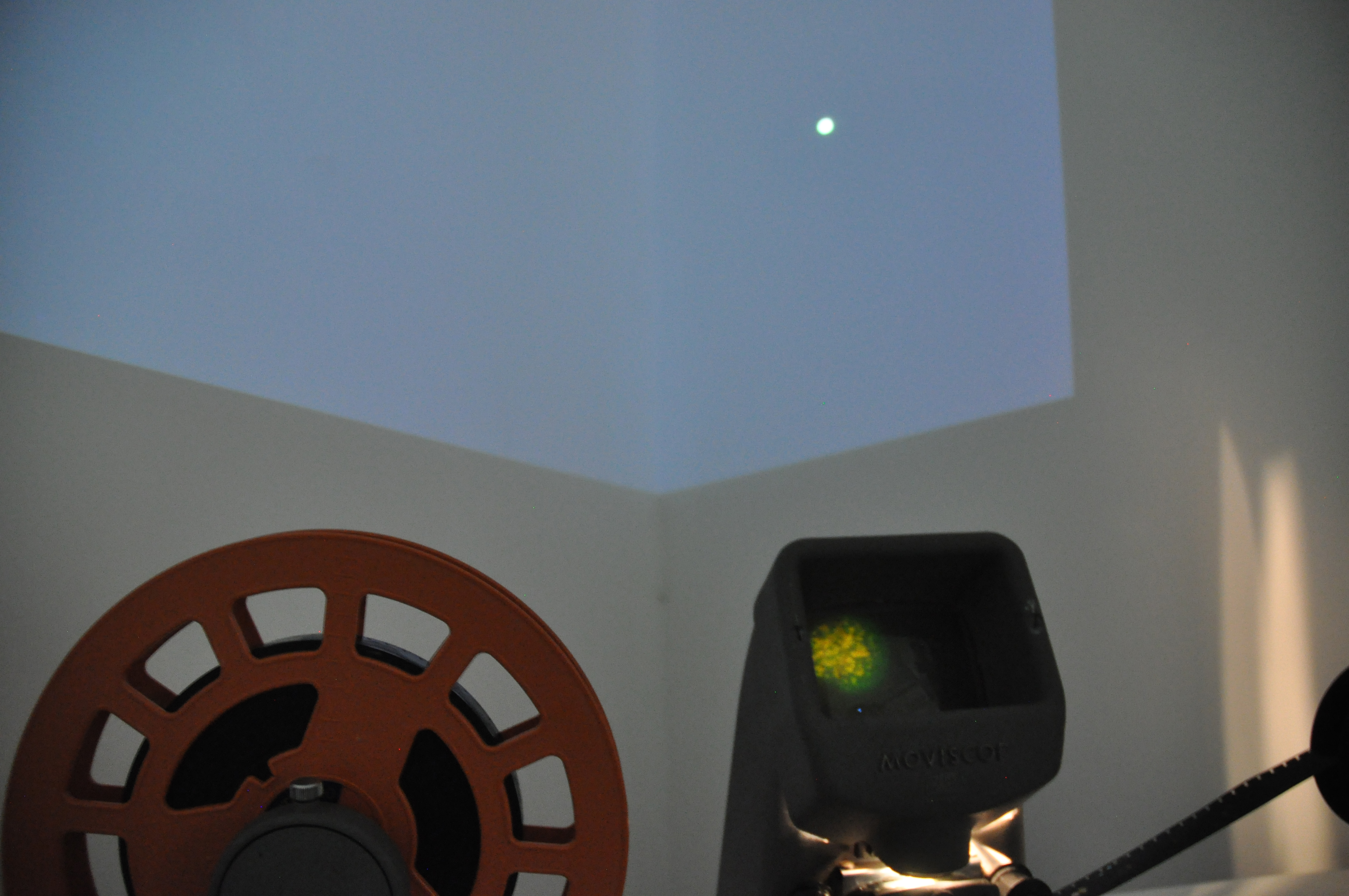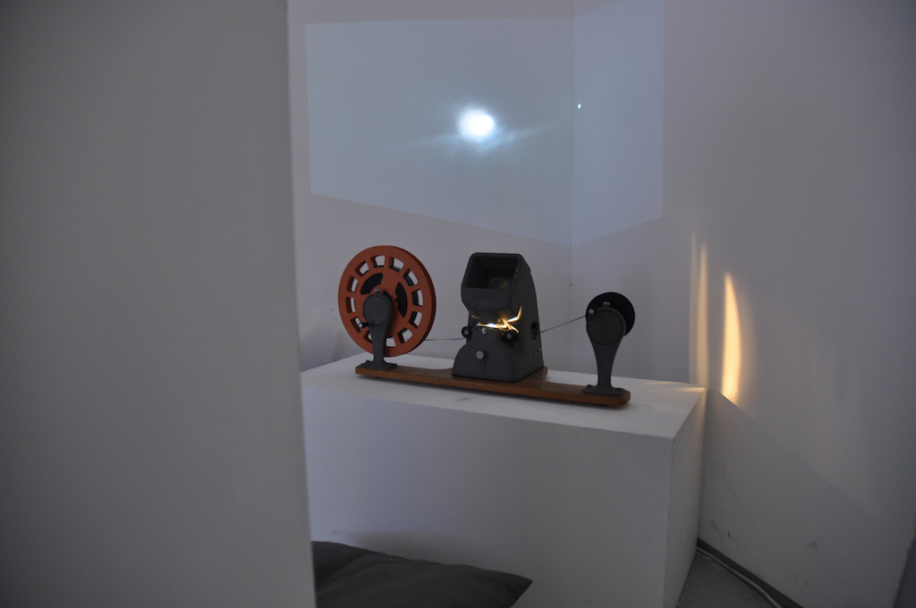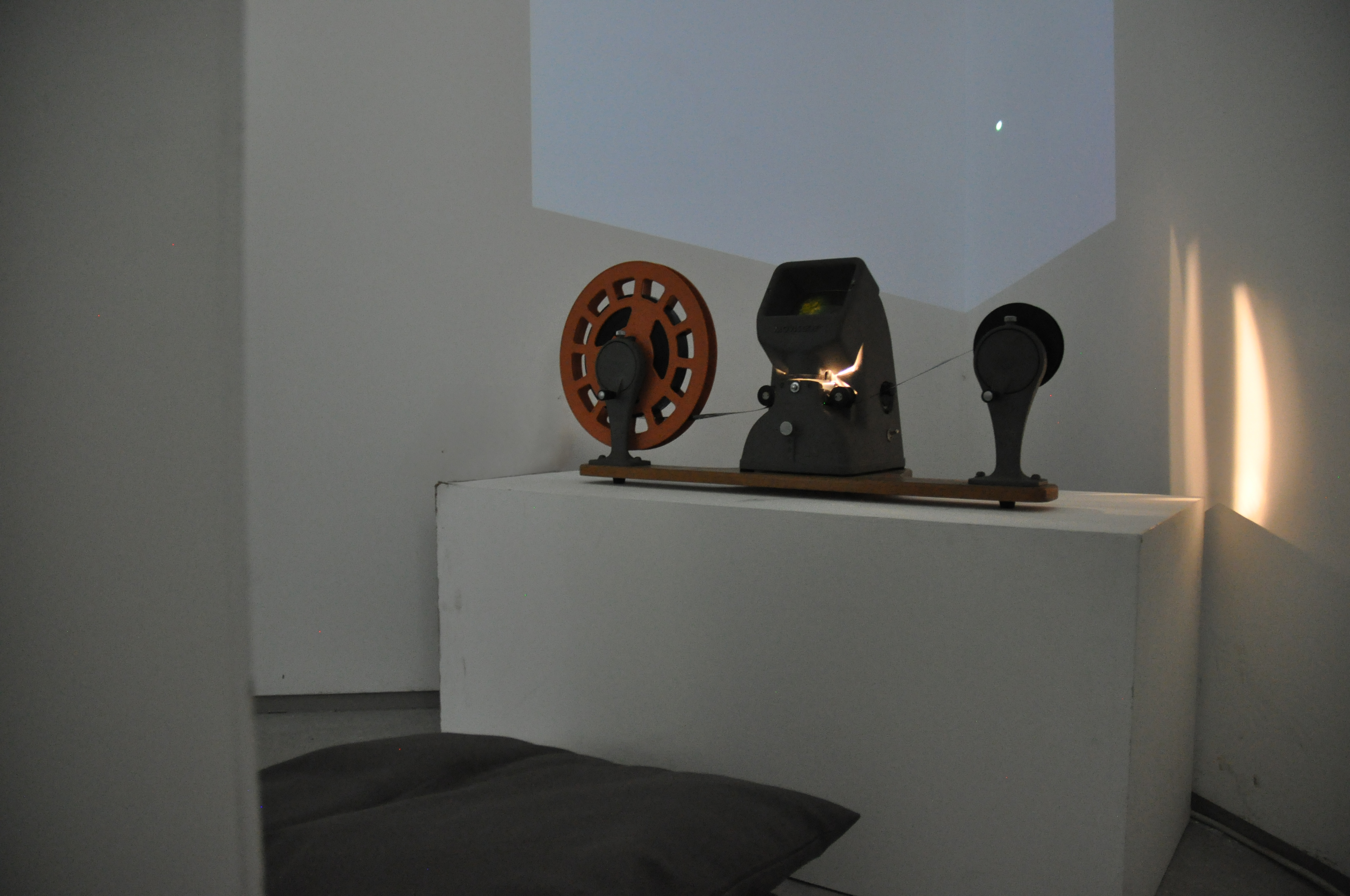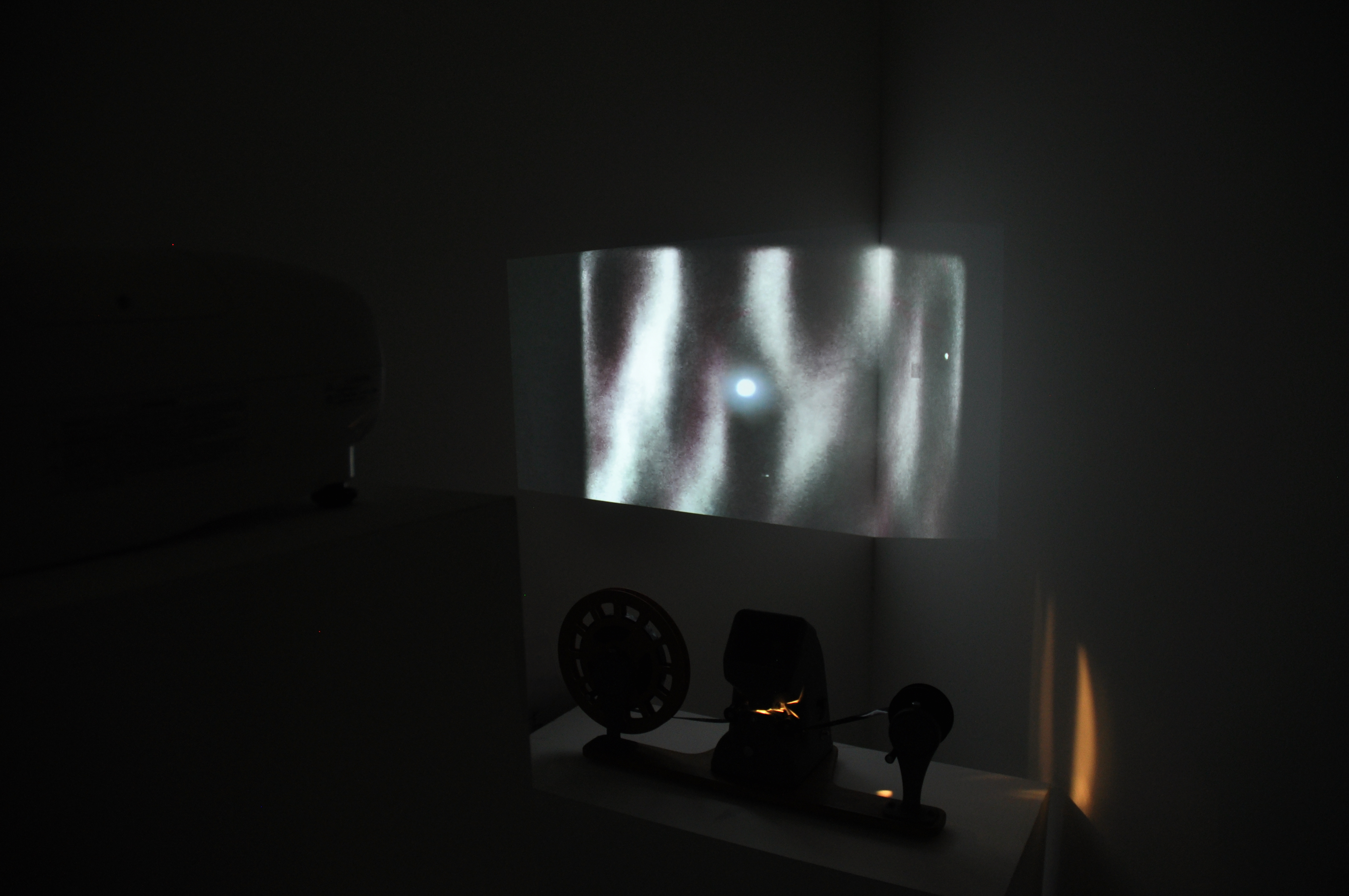 Here you can see a small part of an installation that included two 16mm films and two digital films layered to create one. The 16mm film, that was projected on the wall, was exposed and made during a workshop with the video artist Vicky Smith. The result was compiled with the digital video of the moon and the green star. In front of the display was a short plinth that contained a second 16mm film that I made using bleach. Viewers could sit down and play the film by turning it at their own pace, examining the inperfections through the viewfinder. I decided to place my installation in a corner to emphasise the movement and space between the moon and the green star.