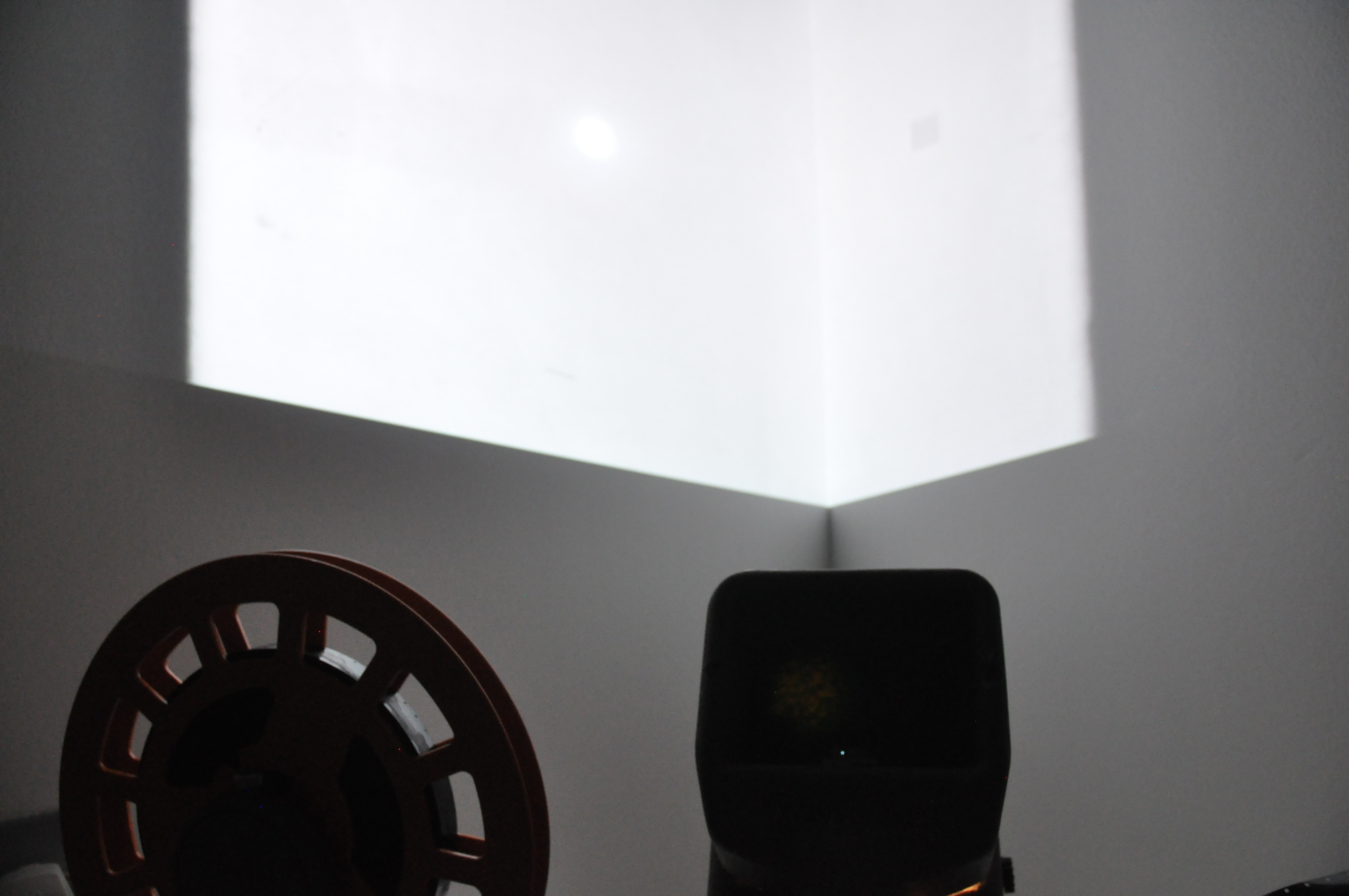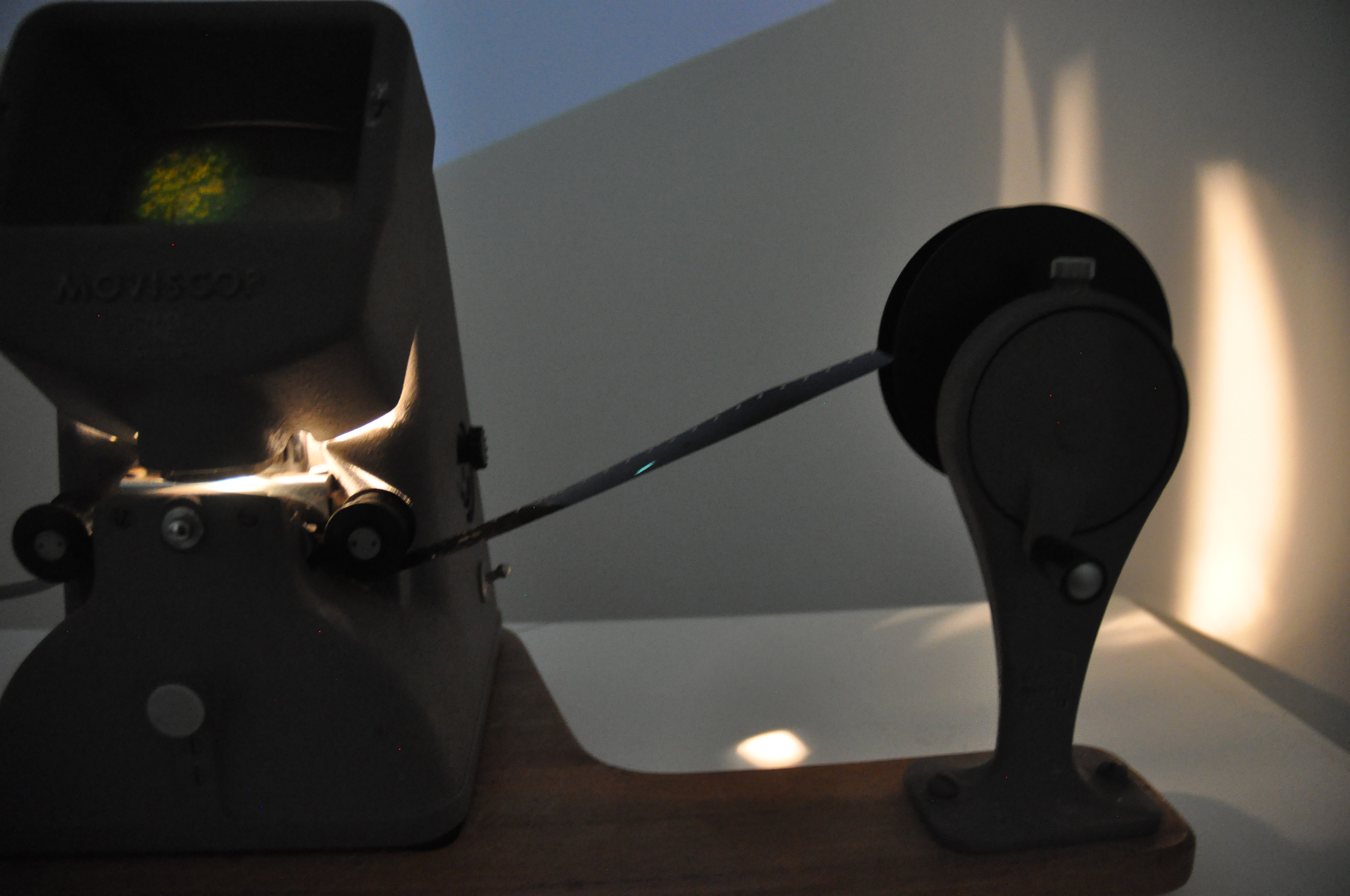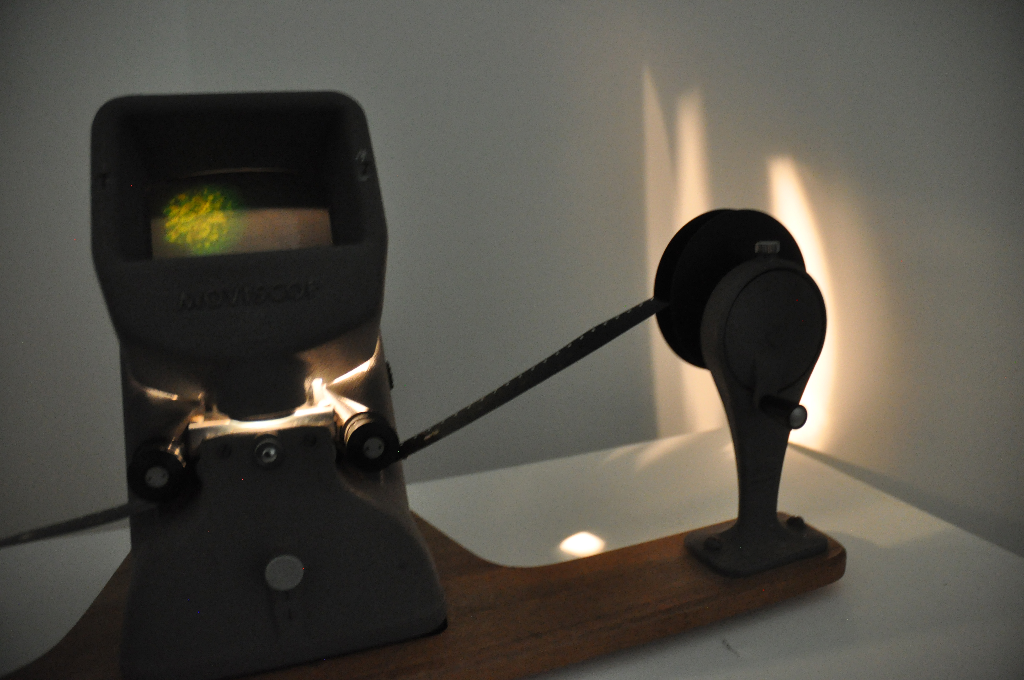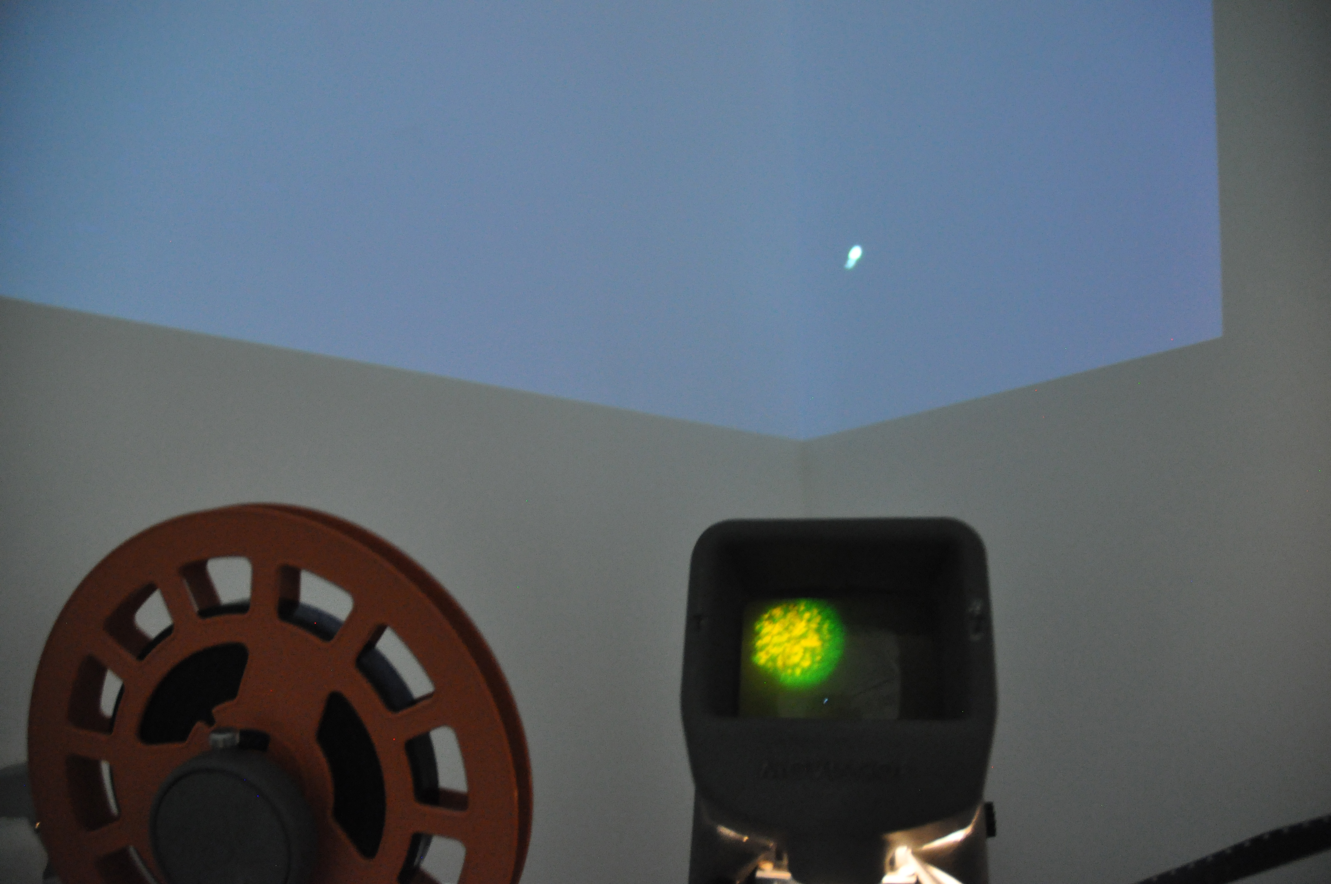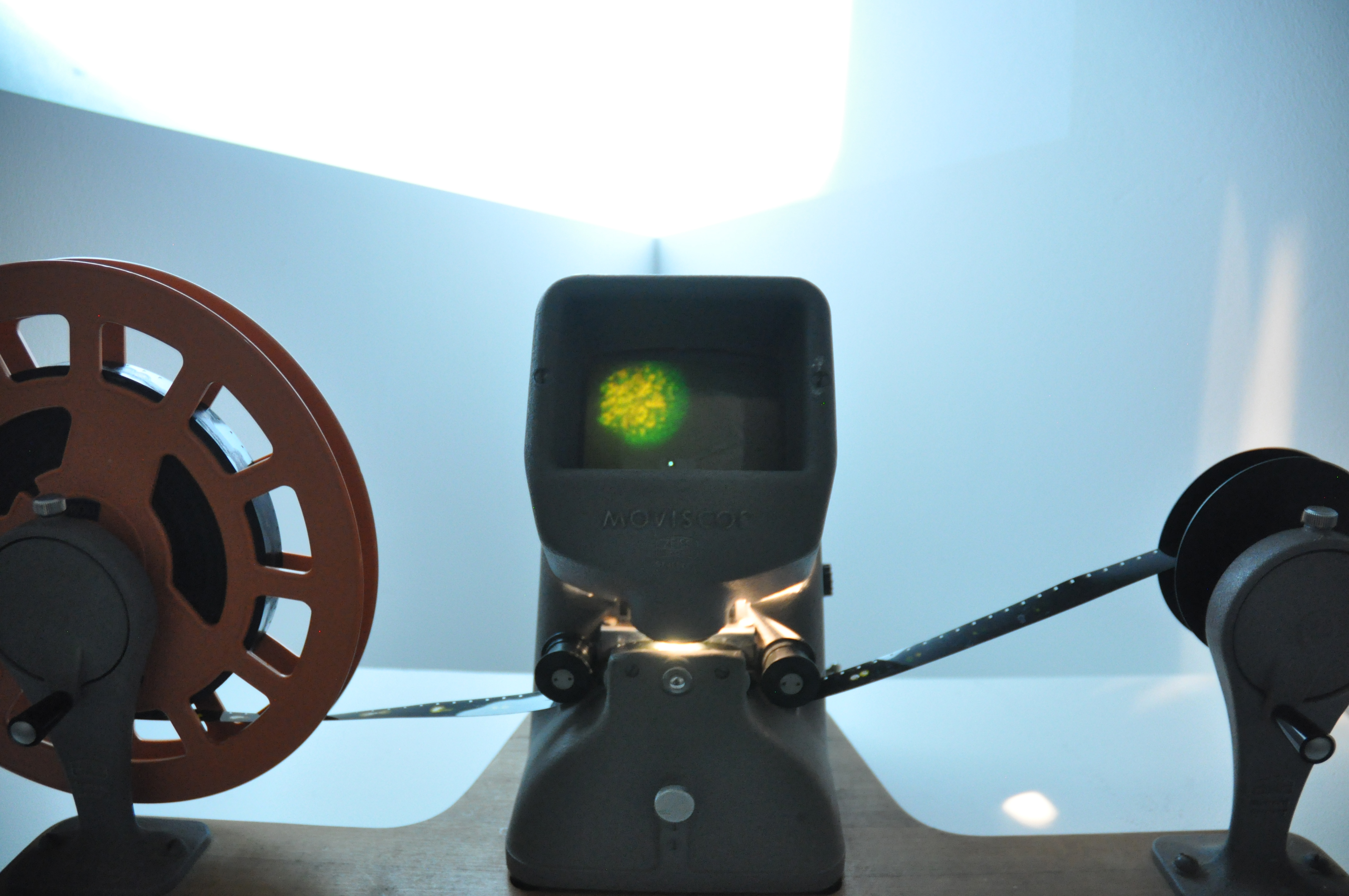 Here you can see a small part of an installation that included two 16mm films and two digital films layered to create one. The 16mm film, that was projected on the wall, was exposed and made during a workshop with the video artist Vicky Smith. The result was compiled with the digital video of the moon and the green star. In front of the display was a short plinth that contained a second 16mm film that I made using bleach. Viewers could sit down and play the film by turning it at their own pace, examining the inperfections through the viewfinder. I decided to place my installation in a corner to emphasise the movement and space between the moon and the green star.